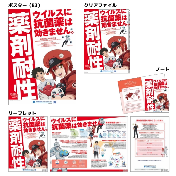 ポスター、リーフレット、クリアファイル、お薬手帳にTVアニメ「はたらく細胞」のキャラクターを活用した薬剤耐性(AMR)対策啓発ツールを全国の病院、薬局店舗などを対象に配布を実施。